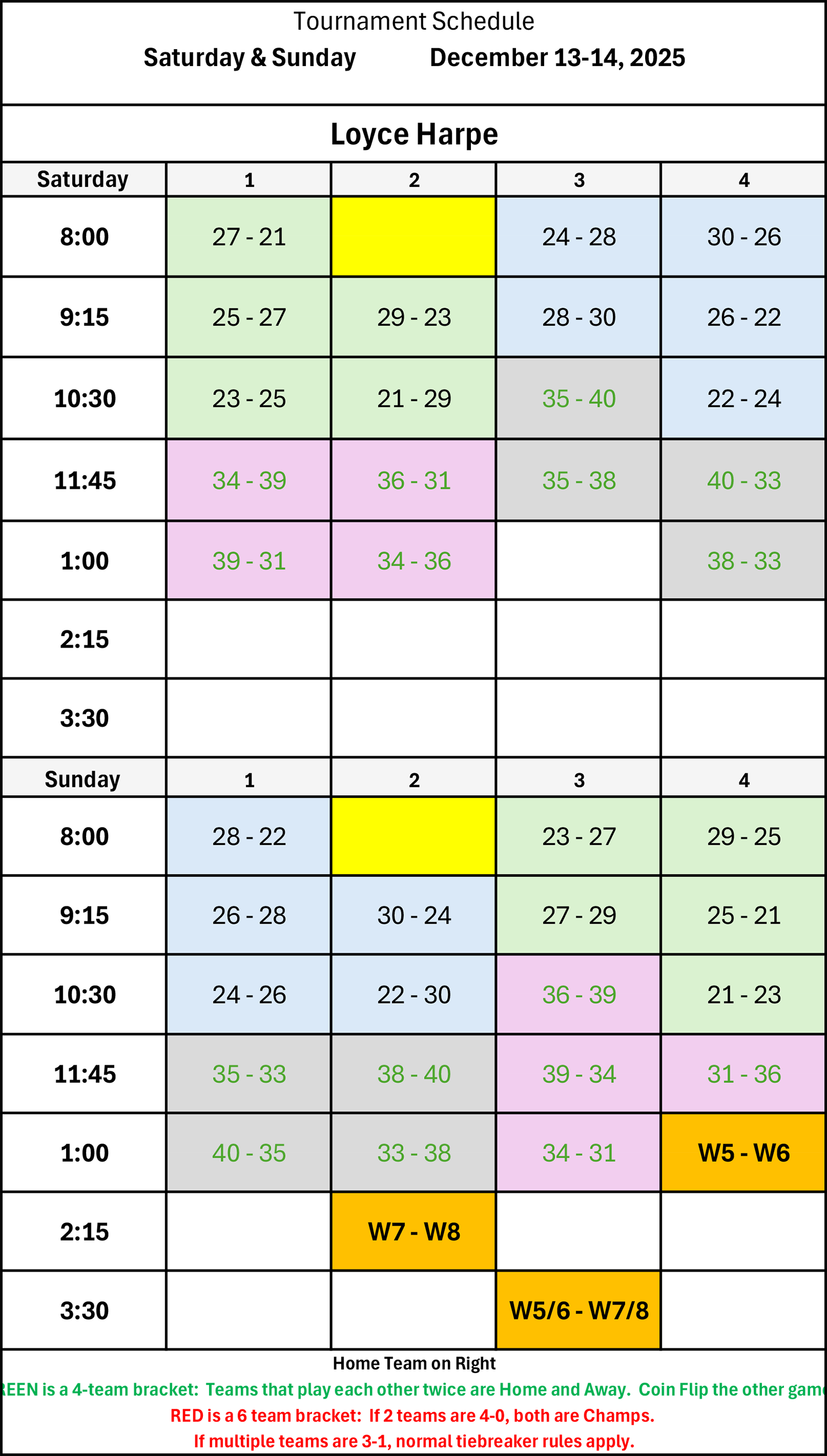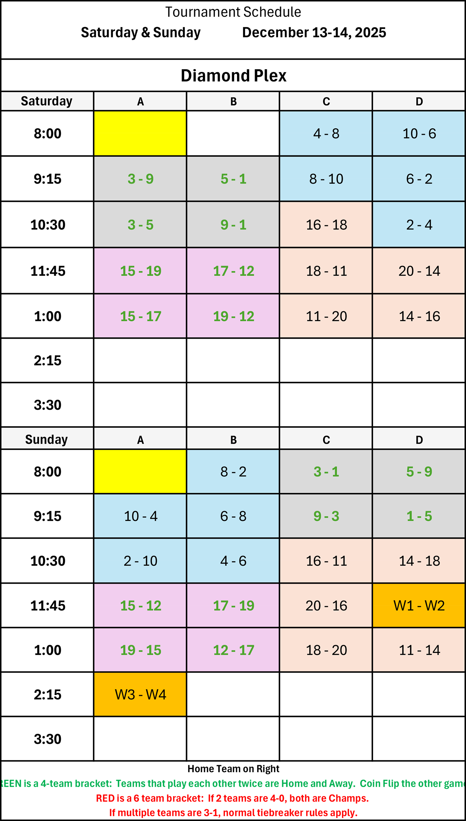 | 9:15 | 19 - 12 | 17 - 15 | 10 - 4 | 6 - 8 |