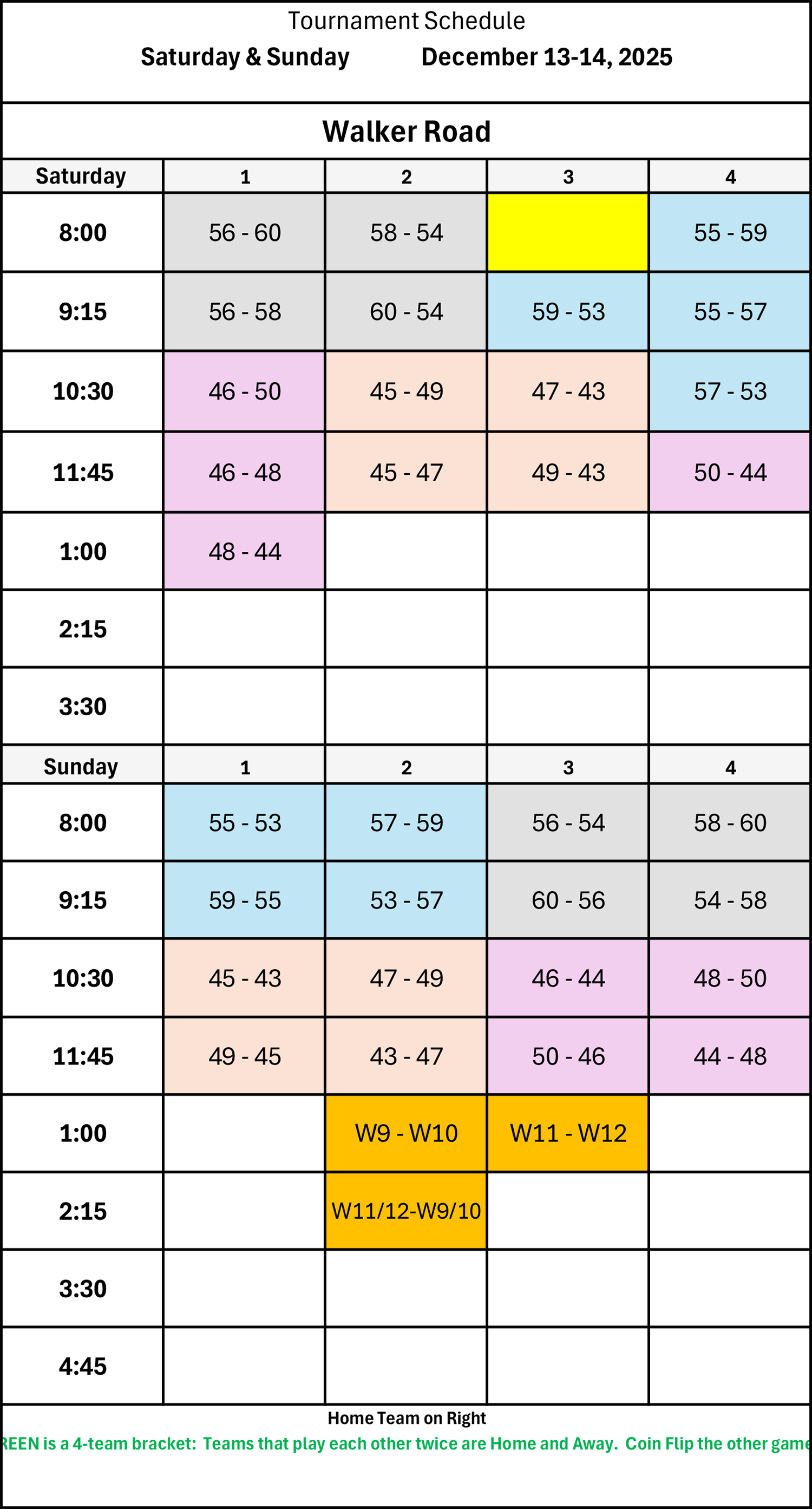 | 9:15 | 48 - 46 | 50 - 44 | 59 - 53 | 57 - 55 |