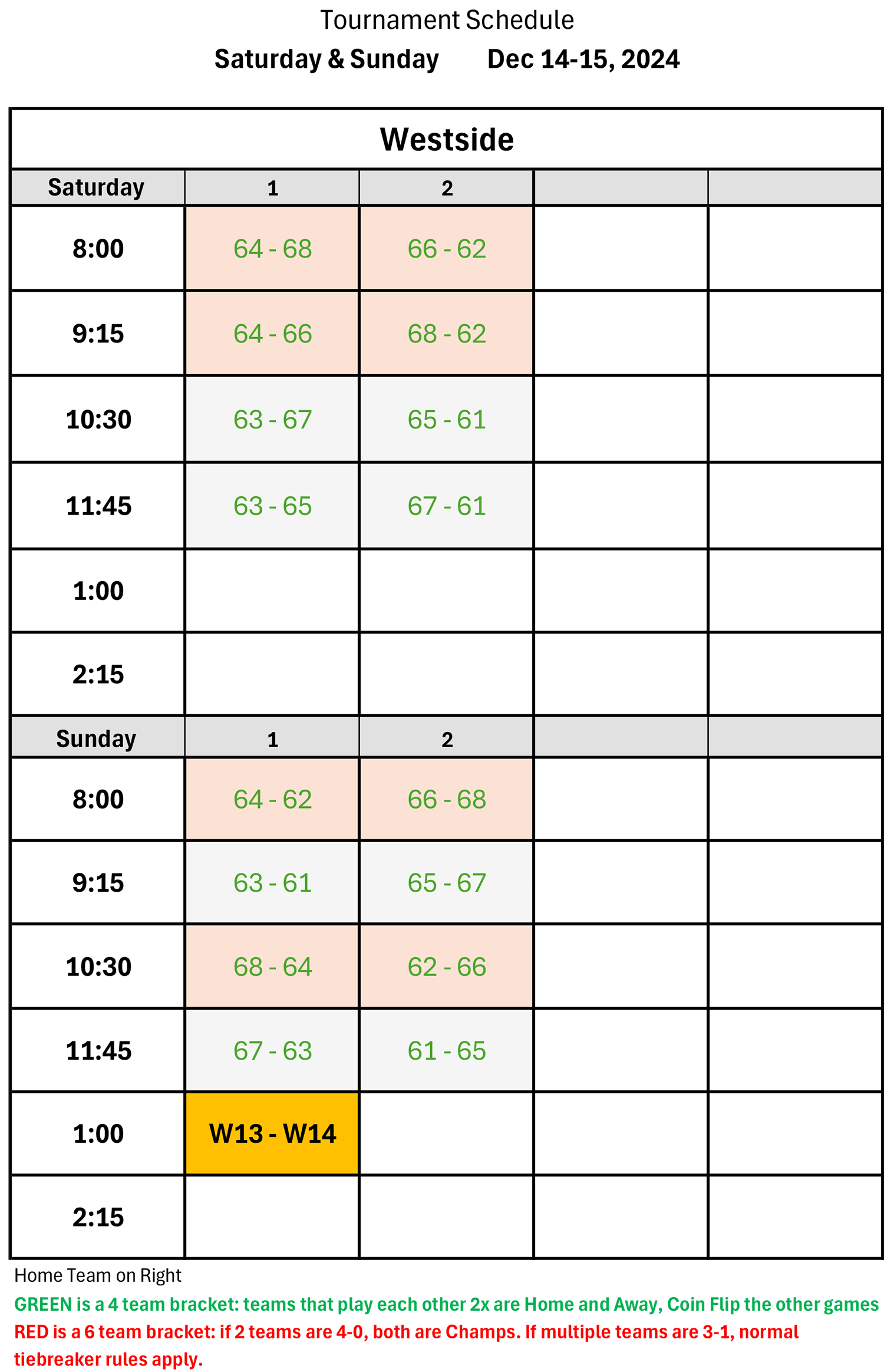 | 9:15 | 68 - 62 | 66 - 64 |