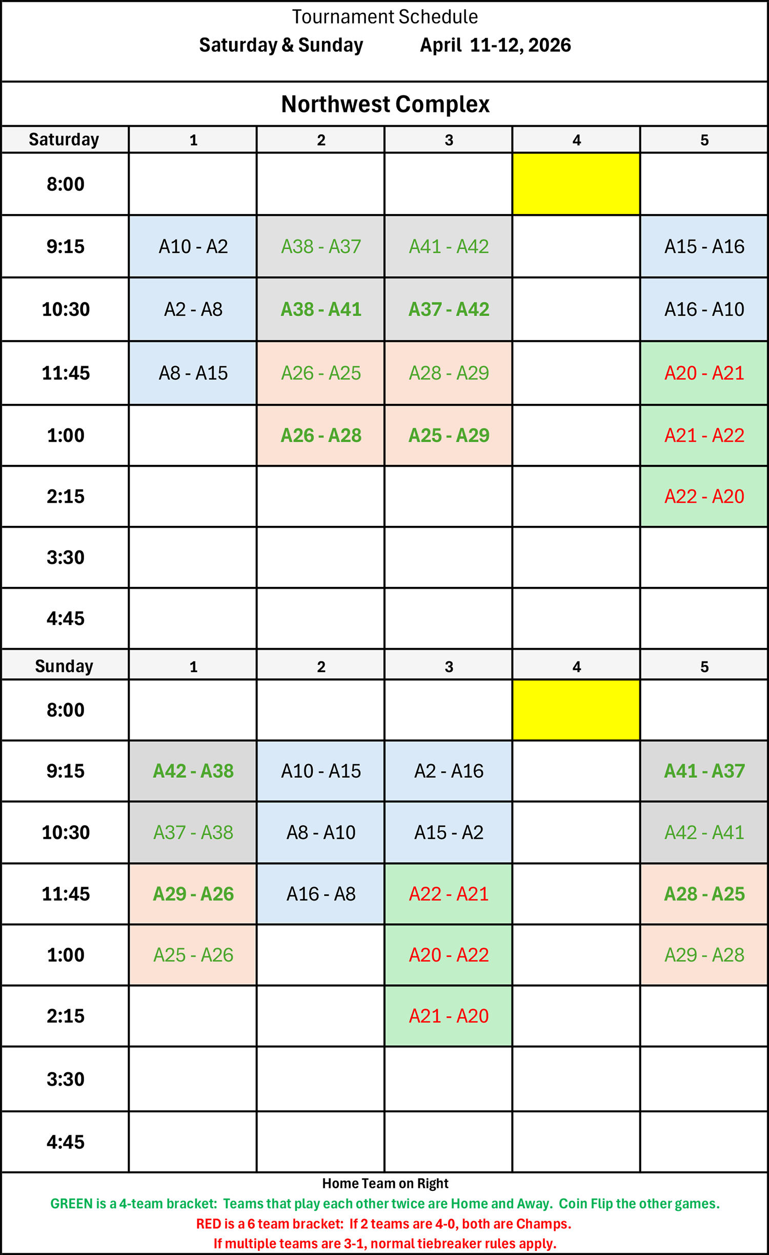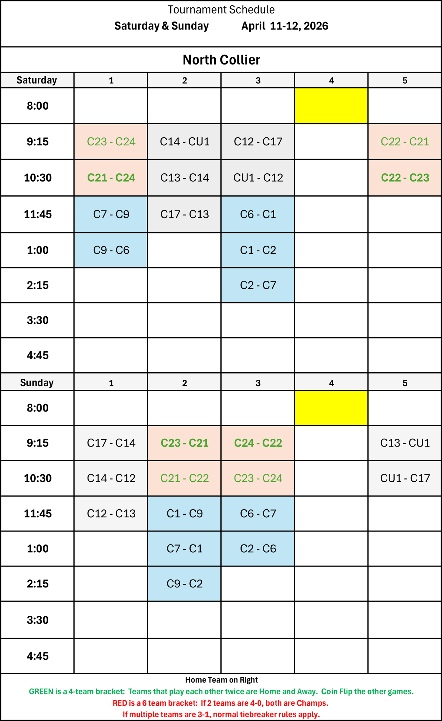 Home team on the right. | Brackets with 4 teams: teams that play each other twice are home & away. Coin flip the other games. | Brackets with 6 teams: if 2 teams are 4-0, both are champs. If multiple teams are 3-1, normal tiebreaker rules apply.