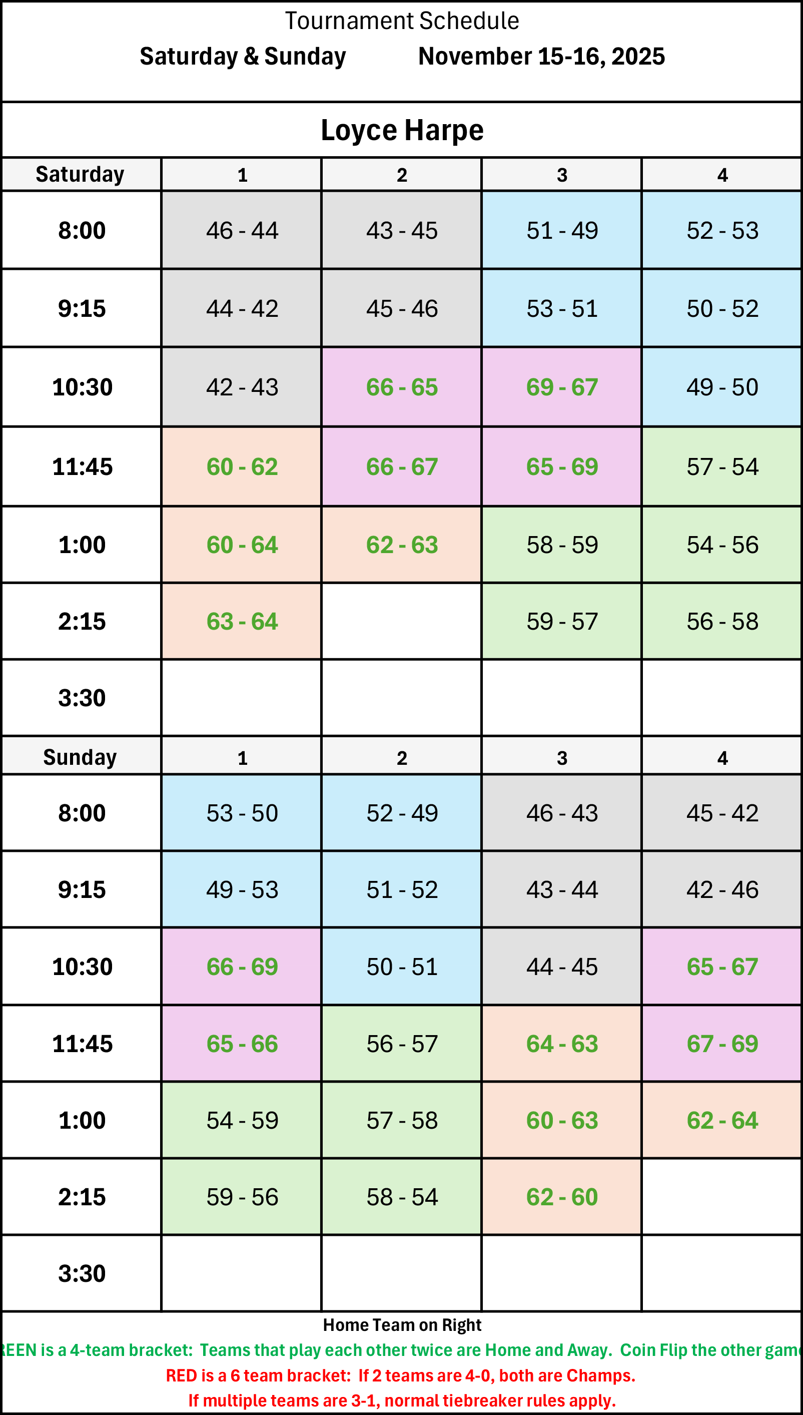 | 10:30 | 44 - 45 | 52 - 49 | 63 - 62 | 64 - 60 |
